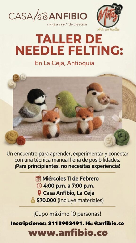 Te invitamos a un espacio de exploración y aprendizaje donde conocerás los fundamentos del needle felting, una técnica textil que permite crear formas tridimensionales a partir de lana y agujas especiales. Durante el taller: Conoceremos un poco de la historia de la técnica y su origen. Exploraremos imágenes y ejemplos de las múltiples posibilidades creativas que ofrece el needle felting. Hablaremos sobre las herramientas y materiales, cómo se usan y para qué sirve cada uno. Realizaremos un modelo tridimensional sencillo, ideal para familiarizarnos con la técnica y el gesto de la aguja. Este es un taller pensado para principiantes, no necesitas experiencia previa. Ese día te prestaremos las agujas y herramientas, para que puedas trabajar con tranquilidad y enfocarte en el proceso. Información del taller 🧵 Cupo máximo: 10 personas 📅 Fecha: Miércoles 11 de febrero 🕓 Horario: 4:00 p.m. a 7:00 p.m. 💰 Valor: $70.000 🎒 Incluye: materiales y préstamo de herramientas Tallerista: David Colorado Motas arte con huellas